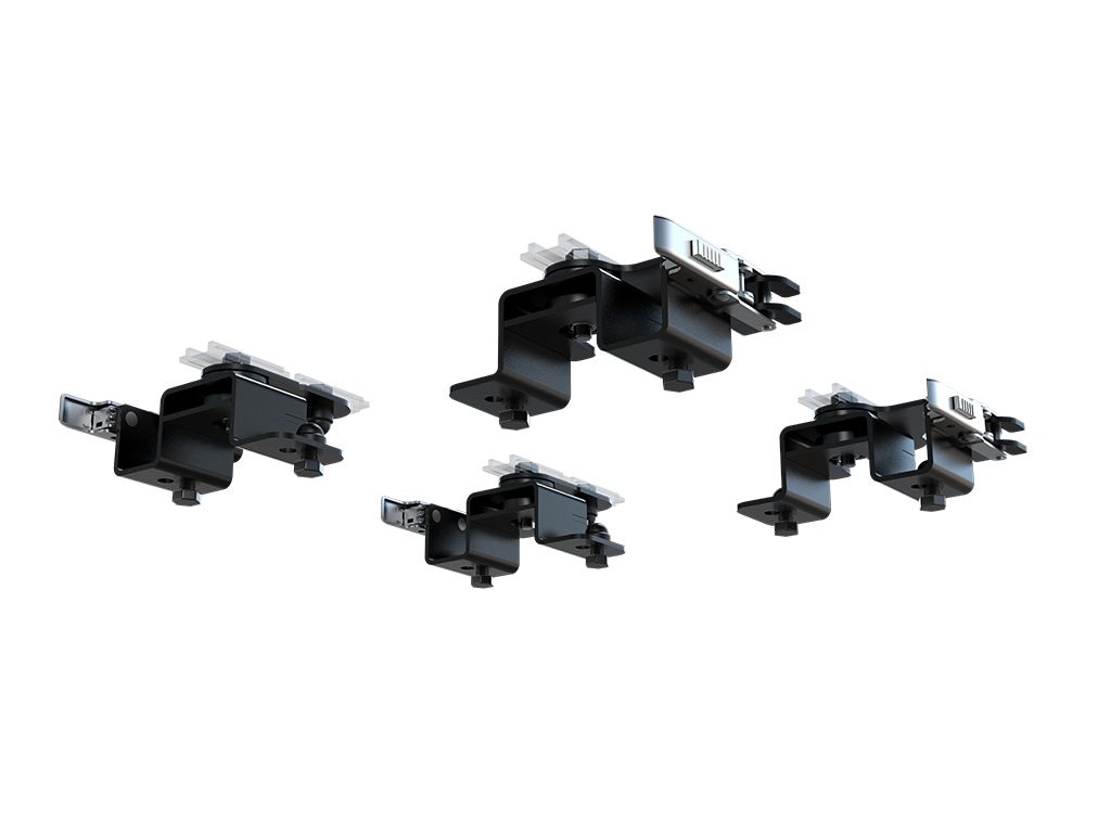 - 4 low profile base brackets are bolted to a Front Runner Rack while 4 self-aligning bushes are secured to the tent base channels using the appropriate Tent Channel Set.