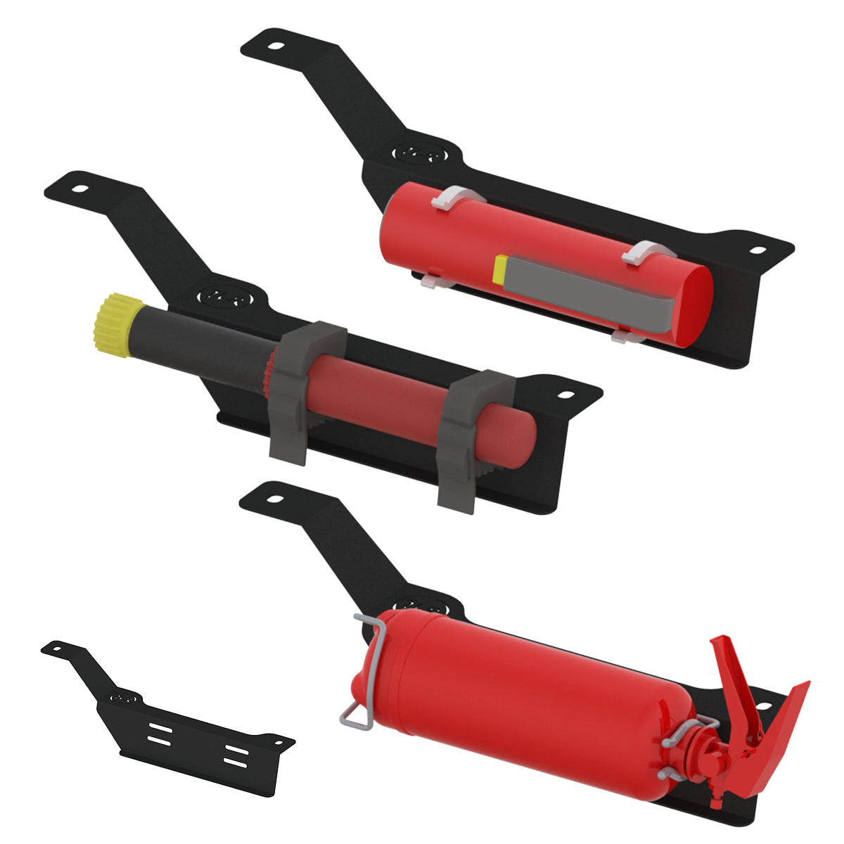 The bracket mounts to the passenger side seat rails and includes mounting holes for most extinguisher options including the below: