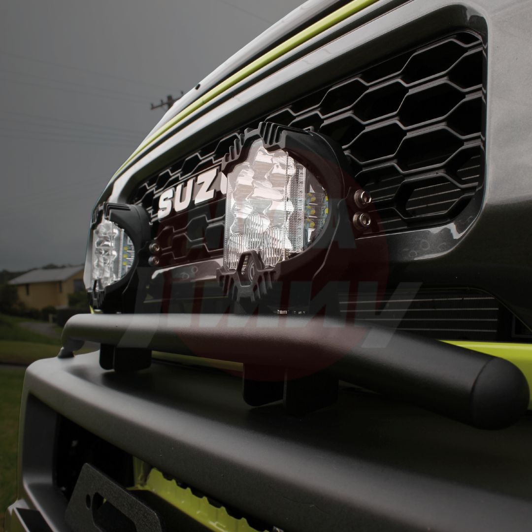 This simple piece only weights approx 1kg & is a complete bolt on solution for the Jimny owner that wants a little more light but doesn't fully need a 50" Lightbar kit on the top of their roof.