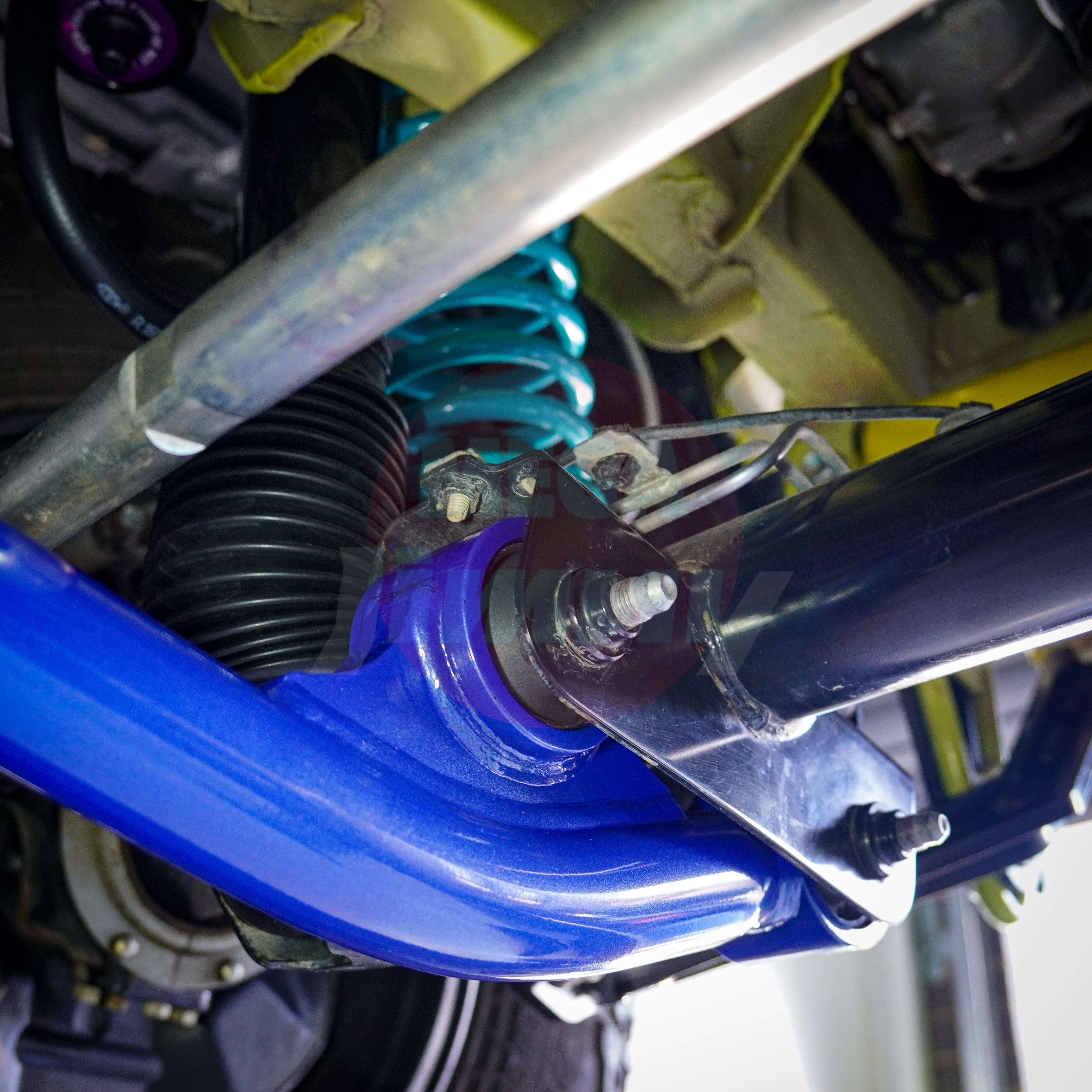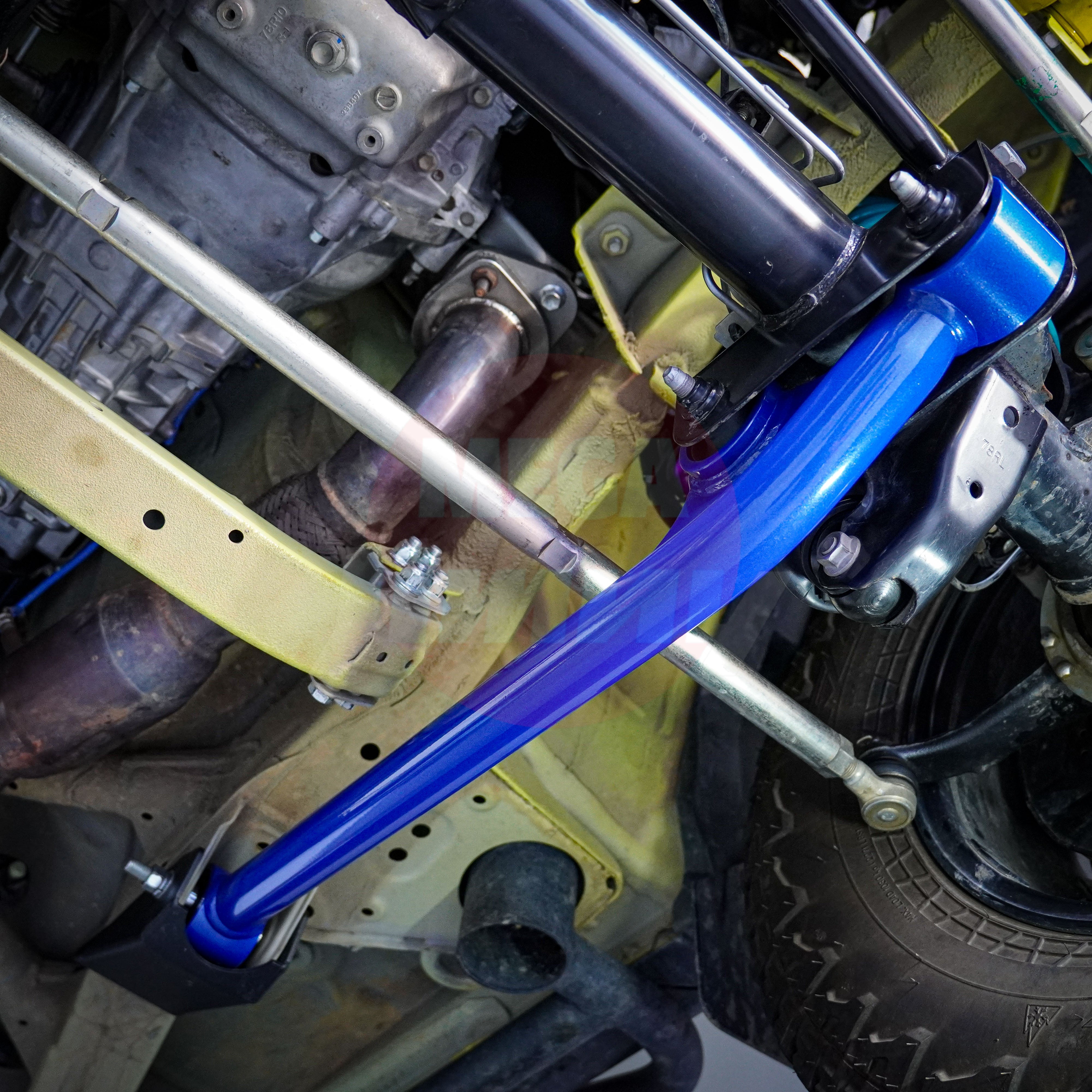 The HARDRACE radius arm is designed for Jimny with 2" lift. The arm features built-in caster increase to maintain factory alignment setting, allowing greater axle movement and handling performance after suspension lifts. With ED coated and painted high strength construction and harden rubber bushing, these arms provide superior strength and durability along with solid driving response.