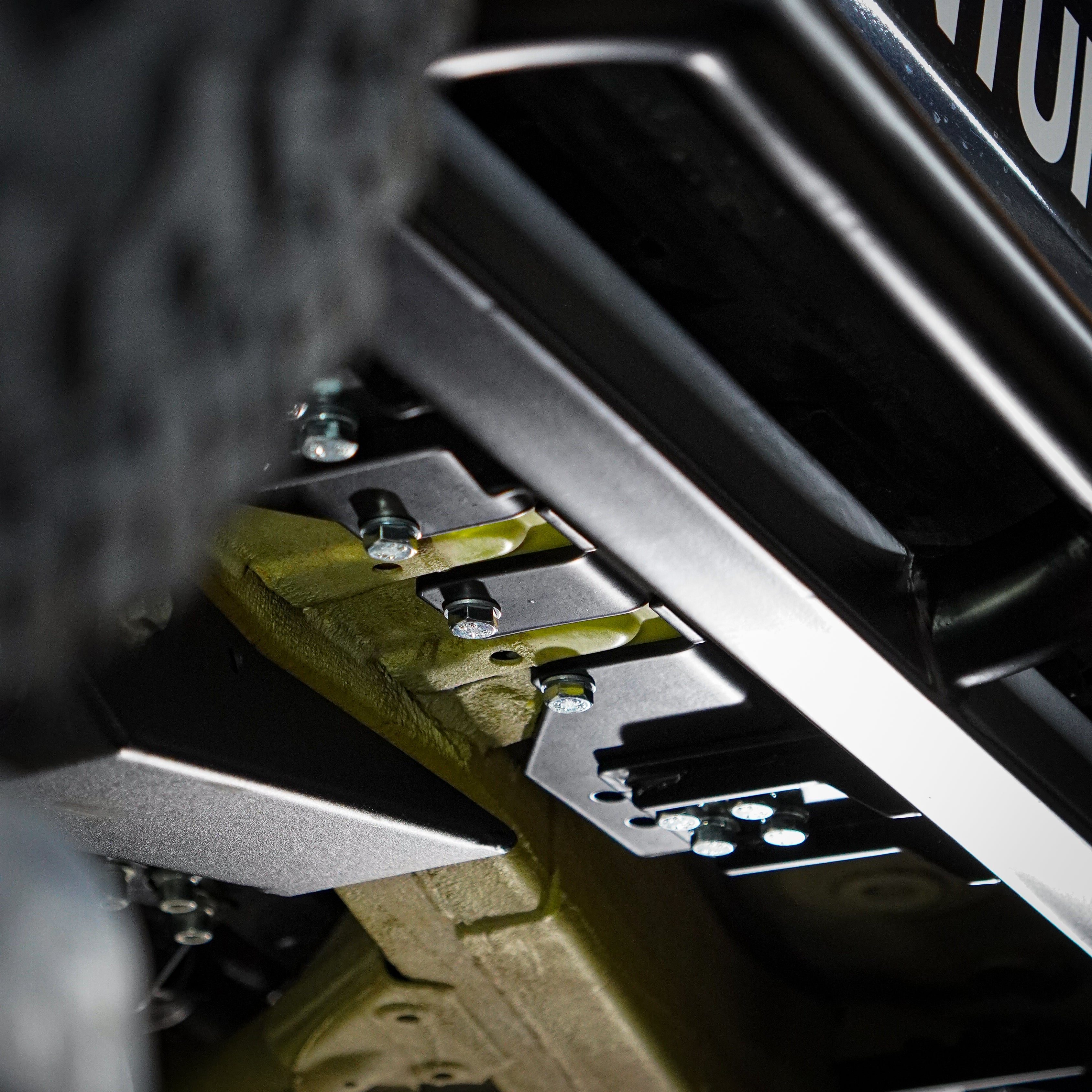 Built to be tough - All of our bracketry is made from 10mm thick steel and uses M10 fasteners throughout and both rock sliders & mounting brackets are powder coated black for extra durability.